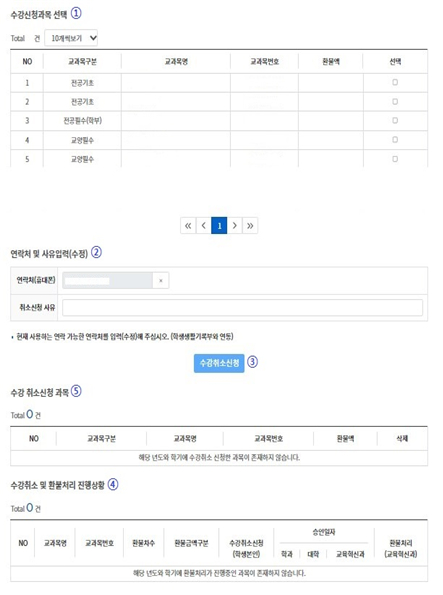 | 수강취소 가능 교과목 수 : 2과목 이내 |