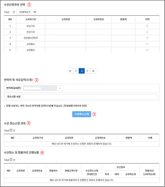 - ⑤의 목록에 수강취소 신청한 과목이 조회되니 확인하시기 바랍니다.