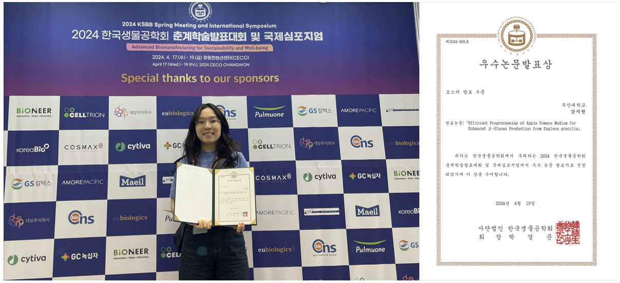 강지원 석사과정생 2024 한국생물공학회 춘계학술발표대회 및 국제심포지엄 '우수논문발표상' 수상